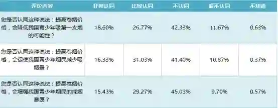 然而,在《报告》的调查过程中,公众对于“提高卷烟价格降低青少年吸烟的三种情况”系列问题的认同比例却较前述调查结果有所降低,甚至出现了“不认同”比例反超的情况。