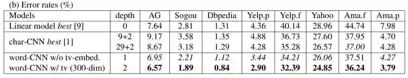 [1] Le H T, Cerisara C, Denis A. Do Convolutional Networks need to be Deep for Text Classification?[J]. arXiv preprint arXiv:1707.04108, 2017. [2] Zhang X, Zhao J, LeCun Y. Character-level convolutional networks for text classification[C]//Advances in neural information processing systems. 2015: 649-657.[3] Rie Johnson and Tong Zhang. 2016. Convolutional neural networks for text categorization: Shallow word-level vs. deep character-level.arXiv:1609.00718 .[4] Kim Y. Convolutional neural networks for sentence classification[J]. arXiv preprint arXiv:1408.5882, 2014.[5] Johnson R, Zhang T. Deep pyramid convolutional neural networks for text categorization[C]//Proceedings of the 55th Annual Meeting of the Association for Computational Linguistics (Volume 1: Long Papers). 2017, 1: 562-570.