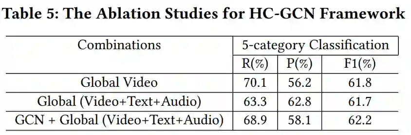 同时,为了进一步检验我们模型图网络建模部分的有效性,我们做了如下对比实验,包括仅用视频(Global Video)和仅利用多模态信息(Global(Video+Text+Audio))进行社交关系分类,实验结果如下表所示。