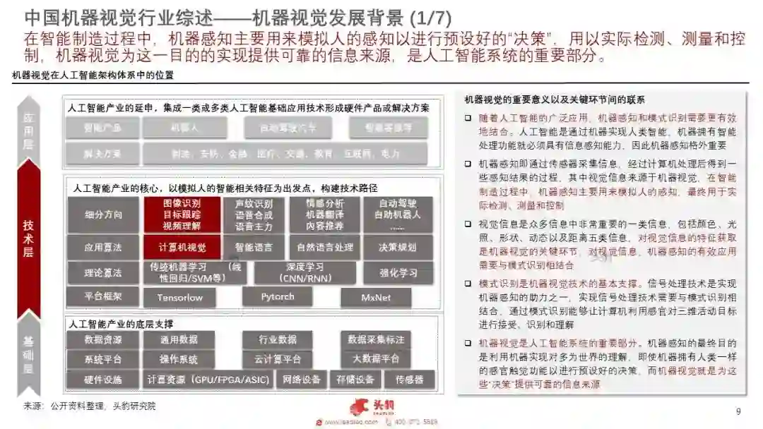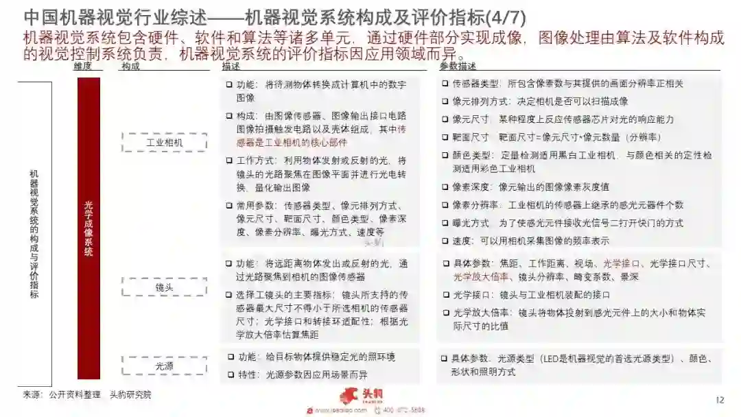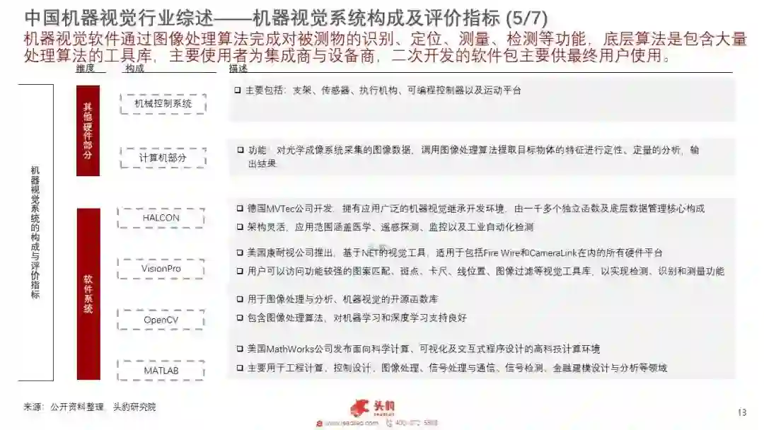 核心零部件:机器视觉系统主要由光源、镜头、相机、图像采集卡以及核心软件五个部分构成。软件中算法是核心硬件中半导体器件是关键。机器视觉行业的上游有光源、镜头、工业相机、图像采集卡、图像处理软件等的提供商。主要下游市场是半导体和电子制造行业。除此之外在汽车、印刷包装、烟草、农业、医药和交通等领域也有广泛应用。