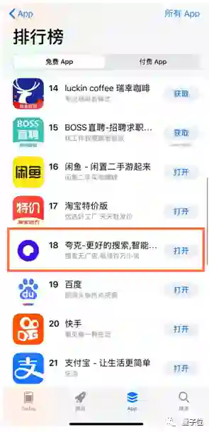今年4月,一款名为“夸克”的智能搜索App首次在苹果应用商店排名超越百度,并首次跻身前20。
