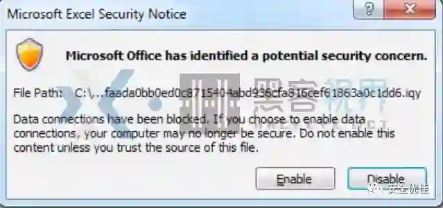 图2.使用Microsoft Excel打开.iqy文件弹出的安全通知