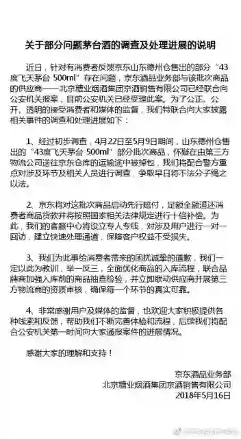 近日,针对有消费者反馈京东山东德州仓售出的部分“43度飞天茅台500m"存在问题,京东酒品业务部与该批次商品的供应商—北京糖业烟酒集团京酒 销售有限公司已经联合向公安机关报案,目前公安机关已经受理此案。