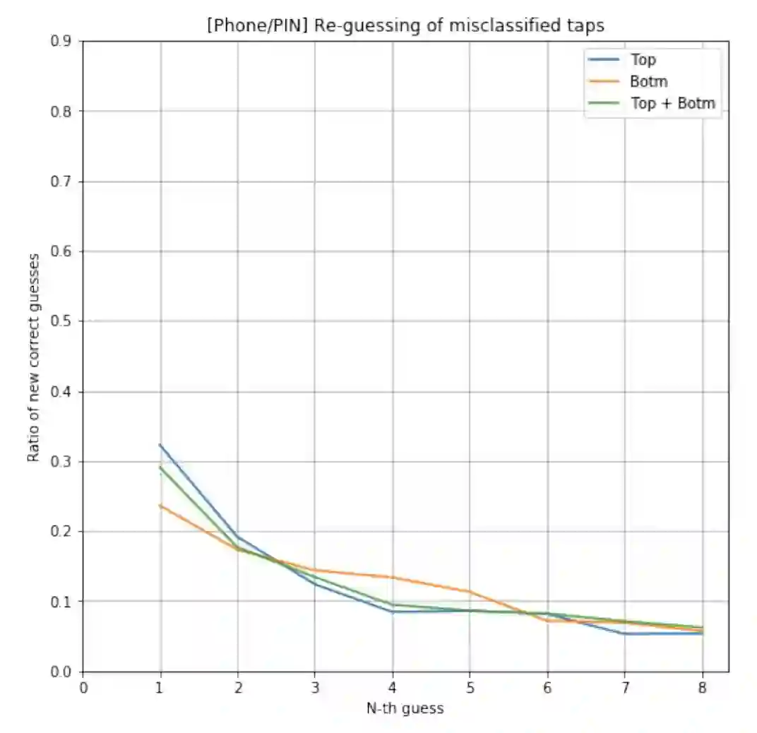 使用单个麦克风,10次尝试后可以恢复54%的PIN。通和先前工作进行了比较发现,在很多情况下往往表现的更好,在其他方面也不输给先前工作。例如,使用两个麦克风,只需20次尝试就可以恢复91/150个PIN码,并不需要知道PIN码的分布情况,也不需要知道后续点击之间的时间间隔。