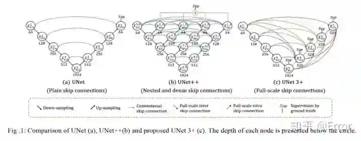 为了弥补UNet和UNet++的缺陷,UNet 3+中的每一个解码器层都融合了来自编码器中的小尺度和同尺度的特征图,以及来自解码器的大尺度的特征图,这些特征图捕获了全尺度下的细粒度语义和粗粒度语义。
