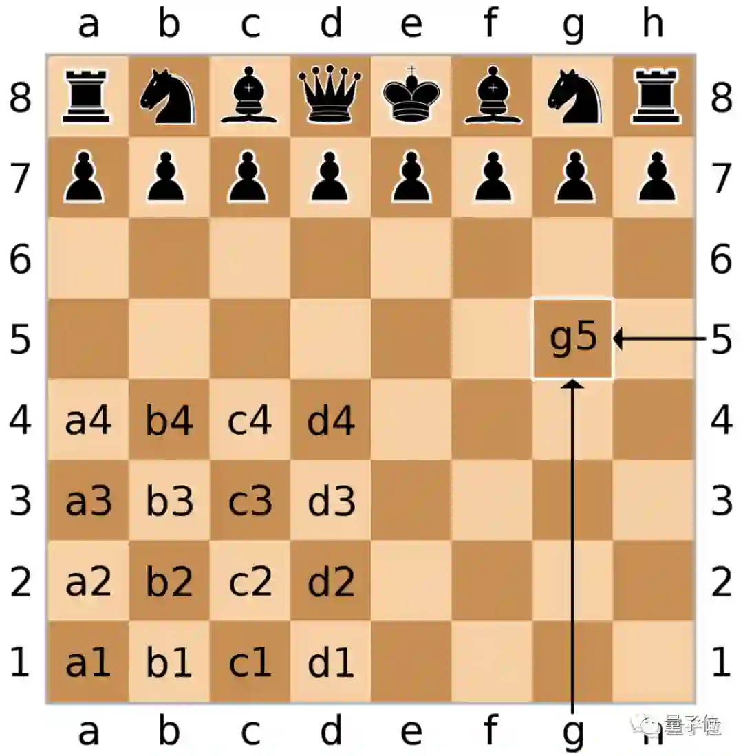 国际象棋8x8的格子一般横向编为小写的a-h、纵向编为1-8,棋子则根据英文单词首字母命名,如后(Queen)就是大写Q,象(Bishop)就是大写B,另外小写x代表吃子。