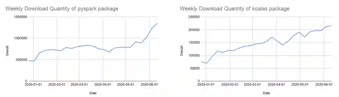 经过一年多的开发,Koalas 实现了将近 80% 的 Pandas API。Koalas 在 PyPI 上的月下载量已迅速增长到 85 万,并以每两周发布一次的节奏快速演进。除了 Koalas,很多人仍在使用 PySpark API,该 API 也越来越受欢迎。