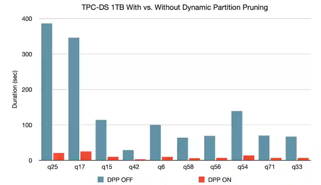 当优化器无法在编译时识别可跳过的分区,可以使用“动态分区修剪”,这在星型模型中很常见(星型模型由一个或多个事实表组成,这些事实表引用了任意数量的维度表)。在执行这种连接操作时,我们可以通过识别维度表过滤之后的分区来修剪从事实表读取的分区。在一个 TPC-DS 基准测试中,102 个查询中有 60 个查询获得 2 到 18 倍的速度提升。