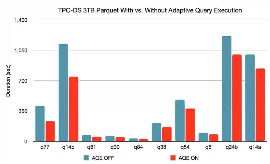 在一个 3TB 的 TPC-DS 基准测试中,与没有 AQE 的 Spark 相比,有 AQE 的 Spark 将两个查询的性能提升了 1.5 倍以上,另外 37 个查询的性能提升了 1.1 倍以上。