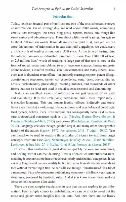 今天,文本是我们生活中不可或缺的一部分,也是最丰富的信息来源之一。平均每天,我们阅读约9000字,包括电子邮件、短信、新闻、博客文章、报告、推特,以及街道名称和广告。在你一生的阅读过程中,这会让你有大约2亿字。这听起来令人印象深刻(事实也的确如此),然而,我们可以在不到0.5 g的空间里存储这些信息:我们可以在u盘上随身携带一生都值得阅读的信息。在我写这篇文章的时候,互联网上估计至少有超过1200 TB的文本,或250万人的阅读价值。现在,大部分文本都以社交媒体的形式存在:微博、推特、Facebook状态、Instagram帖子、在线评论、LinkedIn个人资料、YouTube评论等等。然而,文本即使在线下也是丰富的——季度收益报告、专利申请、问卷答复、书面信函、歌词、诗歌、日记、小说、议会会议记录、会议记录,以及成千上万的其他形式,可以(也正在)用于社会科学研究和数据挖掘。