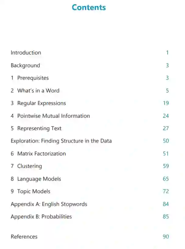 这本书分成两部分。在前半部分,我们将学习文本和语言的一些基本属性——语言分析的层次、语法和语义成分,以及如何描述它们。我们还将讨论为我们的分析删除哪些内容,保留哪些内容,以及如何计算简单、有用的统计数据。在下半部分,我们将着眼于探索,发现数据中的潜在结构。我们将从简单的统计学习到更复杂的机器学习方法,如主题模型、词嵌入和降维。