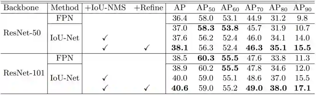 表 3:在 MS-COCO 上的最终实验结果。IoU-Net 表示嵌入 IoU 预测器的 ResNet-FPN。在这个 FPN 基准上,研究者实现了约 2% 的 AP 提升。