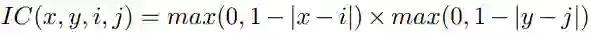 研究者引入了精准 RoI 池化(简写成:PrRoI 池化)来助力研究者的边界框修正。其没有任何坐标量化,而且在边界框坐标上有连续梯度。给定 RoI/PrRoI 池化前的特征图 F(比如,来自 ResNet-50 中的 Conv4),设 wi,j 是该特征图上一个离散位置 (i,j) 处的特征。使用双线性插值,这个离散的特征图可以被视为在任意连续坐标 (x,y) 处都是连续的: