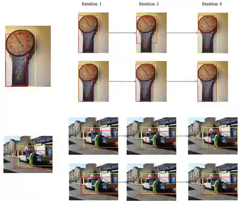 边界框修正示例:上行是传统方法的结果,下行是本文提出方法的结果。