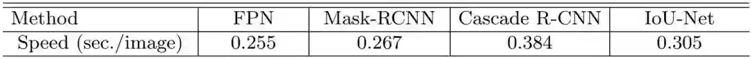IoU-Net 可与目标检测框架一起并行地端到端优化。研究者发现,将 IoU 预测器添加到网络中有助于网络学习更具判别性的特征,这能分别将 ResNet50-FPN 和 ResNet101-FPN 的整体 AP 提升 0.6% 和 0.4%。IoU 引导式 NMS 和边界框修正还能进一步提升表现。研究者使用 ResNet101-FPN 得到了 40.6% 的 AP,相比而言基准为 38.5%,提升了 2.1%。表 4 给出了推理速度,表明 IoU-Net 可在计算成本承受范围之内实现检测水平的提升。