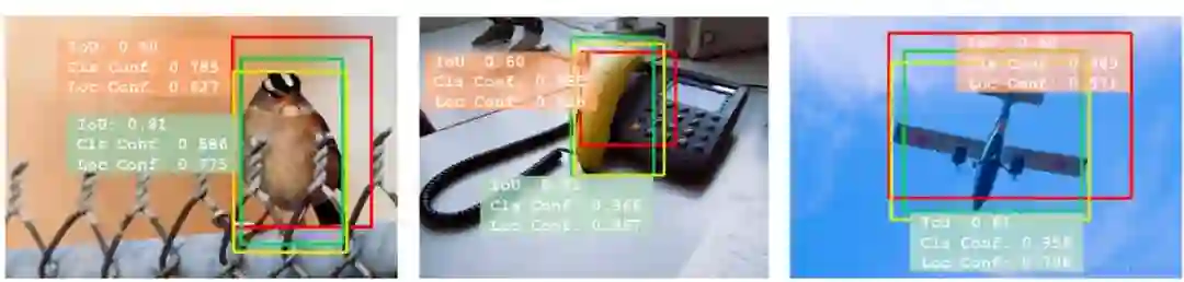在这样的检测流程中,分类和定位被用不同的方法解决。具体来说,给定一个提议框(proposal),每个类别标签的概率可自然而然地用作该提议的「分类置信度」,而边界框回归模块却只是预测了针对该提议框的变换系数,以拟合目标物体的位置。换而言之,在这个流程缺失了「定位置信度」。