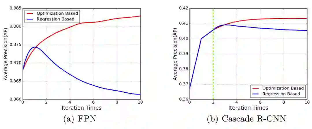 图 4:基于优化的与基于回归的 BBox 优化。(a)在 FPN 中比较。当迭代式地应用回归时,检测结果的 AP(平均精度)首先会提升,但会在之后的迭代中快速降低。(b)在 Cascade R-CNN 中比较。迭代 0、1、2 表示 Cascade R-CNN 中的第 1、2、3 个回归阶段。在多轮回归之后,AP 稍有下降,而基于优化的方法则进一步将 AP 提高了 0.8%。