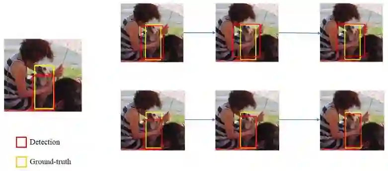 定位置信度的缺失带来了两个缺点。(1)首先,在抑制重复检测时,由于定位置信度的缺失,分类分数通常被用作给检测框排名的指标。在图 1(a) 中,研究者展示了一组案例,其中有更高分类置信度的检测框却与其对应的目标物体有更小的重叠。就像 Gresham 著名的「劣币驱逐良币」理论一样,分类置信度和定位准确度之间的不匹配可能会导致定位更准确的边界框在 NMS 过程中反而被更不准确的边界框抑制了。(2)其次,缺乏定位置信度使得被广泛使用的边界框回归方法缺少可解释性或可预测性。举个例子,之前的研究 [3] 报告了迭代式边界框回归的非单调性。也就是说,如果多次应用边界框回归,可能有损输入边界框的定位效果(见图 1(b))。
