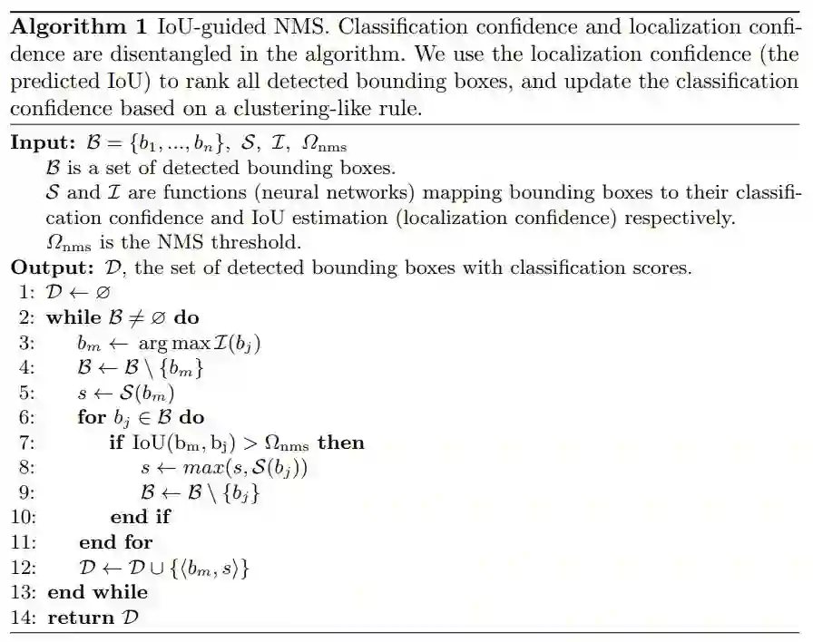 算法 1:IoU 引导式 NMS。在这个算法中,分类置信度和定位置信度是解开的(disentangled)。研究者使用定位置信度(预测得到的 IoU)来给所有被检测到的边界框排名,然后基于一个类似聚类的规则来更新分类置信度。
