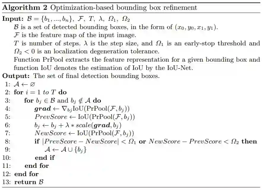 在推理过程中,研究者首先对初始坐标应用边界框回归。为了加快推理速度,研究者首先在所有检测到的边界框上应用 IoU 引导式 NMS。然后,使用基于优化的算法进一步改进 100 个有最高分类置信度的边界框。研究者设置步长为 λ=0.5,早停阈值为 Ω1=0.001,定位衰减容限 Ω2=−0.01,迭代次数 T=5。