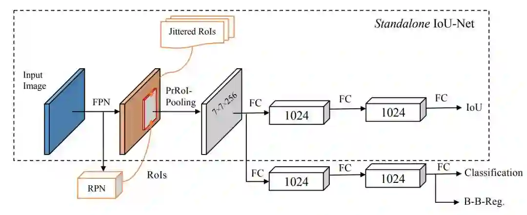 为了定量地分析 IoU 预测的有效性,研究者首先在 3.1 节提出了用于训练 IoU 预测器的方法。在 3.2 和 3.3 节,研究者分别展示了如何将 IoU 预测器用于 NMS 和边界框修正的方法。最后在 3.4 节,研究者将 IoU 预测器整合进了 FPN [16] 等现有的目标检测器中。
