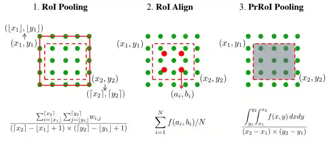 图 6:RoI 池化、RoI Align 和 PrRoI 池化的图示