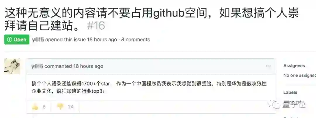 不过,GitHub作为一个源代码托管平台,虽然偶尔也有像996.icu、女装大佬合辑、杭州买房指南这种非代码项目,不过大抵是和程序员群体的日常工作生活相关的,而这份任正非语录,在被程序员们纷纷标星之余,也在issues和微博上引发了一些争议。
