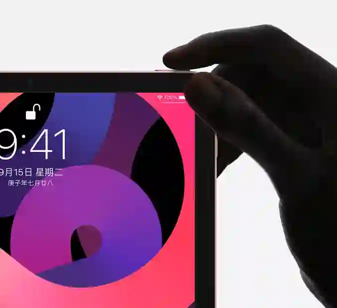 主要功能方面,iPad Air(第四代)配备一块 10.9 英寸 Liquid 视网膜显示屏,支持原彩显示、P3 广色域,但不支持 Pro Motion 120Hz 自适应刷新率。采用全面屏的设计但没有面容识别的加入,而是在顶部按钮集成了指纹识别。尽管没有面容识别方便,但这颗顶部按钮支持多角度、多手指识别,因此指纹解锁或安全支付都没有任何障碍。