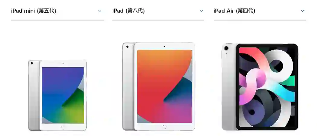 iPad mini(第五代)容量有 64GB(¥2921 起)和 256GB(¥4090 起)可选,支持无线局域网,可选蜂窝网络。可能是由于容量翻倍、屏幕更好,价格比 iPad(第八代)高出不少。iPad mini(第五代)发布于 2019 年 3 月,在短期内有可能会更新,综合价格以及其它 iPad 配置来看,现在不推荐购买。