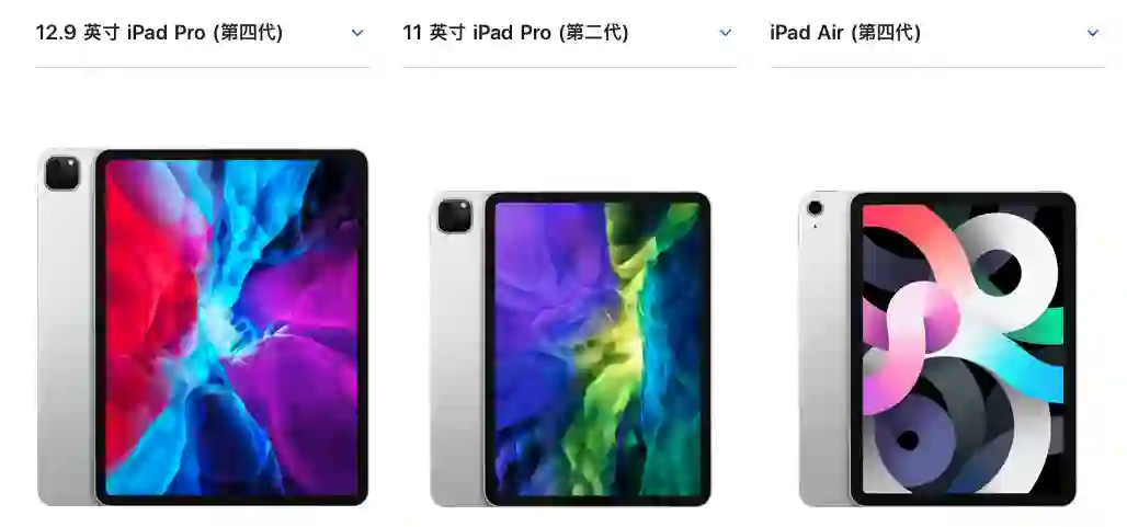iPad Pro(第四代)容量有 128GB(¥6299起)、256GB(¥8699起)、512GB(¥10299起)、1TB(¥11899起)可选,支持无线局域网,可选蜂窝网络。尺寸有 12.9 英寸和 11 英寸可选,12.9 英寸比11 英寸售价高出 ¥1670。11 英寸 iPad Pro(第二代)和 12.9 英寸 iPad Pro(第四代)发布于 2020 年3 月,短期内可能会更新,不急的话可以再等等。