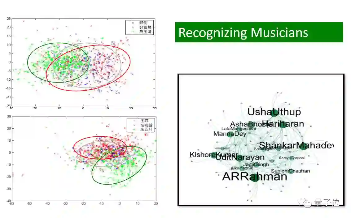比如我们能看到三个歌手,把他们所有的歌曲放到一个二维度,我们就能直观地看见红色的歌手和蓝色的歌手曲风比较接近。右边也是一个方法,寻找的是宝莱坞的音乐家之间的互相影响关系。这对音乐推荐来说是一个很重要的事情。