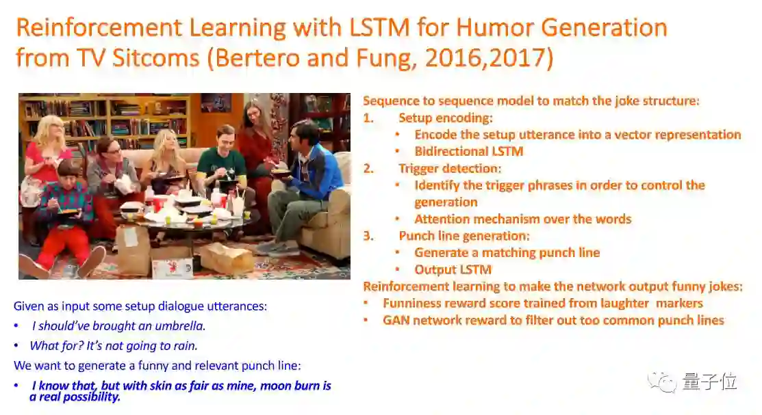 第二步,humor generation,就是让机器能够抛出笑点。跟我们刚刚说的Chatbot相似,但又有一点不一样的是,它的目的是让人笑。在里面除了用sequence2sequence learning model,也加上了reinforcement learning,就是在训练的过程中在有人笑的地方加强学习。在这个领域来讲,这还是刚刚开始的工作。