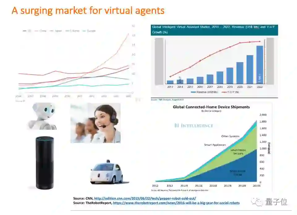 我们现在可以看到有很多需要虚拟助手的场景,比如机器人客服。从现在到未来的十五年,我们可以看到家庭机器人、服务机器人这些市场的重心都会移到中国、亚洲,而不是在欧美。所以机器人如果是来帮助人,为人做服务,非常需要一个软件来理解人的需求。现在的客户服务这些工作,可以用机器来代替,但这个机器需要明白人需要什么。比如无人驾驶,车本身就成为了人的助手,需要人来告诉它我们的需求;另外就是智能家居,现在的发展方向就是人机交互。