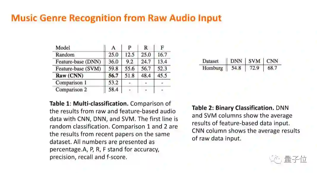 可以看看它的效果,这是在2016年,它的效果和传统的SVM差不多,而SVM是需要提取1000-2000个特征。下图是音乐曲风的识别。