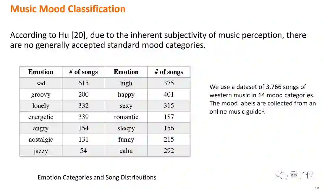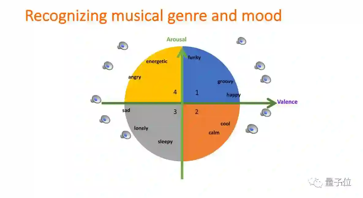 首先想说一下对音乐的分析。之所以做音乐,是因为音乐本身就是表达情感的。下图的横轴是valence,表示人的高兴程度;竖轴arousal表示人的激动程度。音乐和人的情感是同一个plan。所以我们在做音乐分析的时候,想看能不能用机器学习的方法,直接把音乐的风格区分开。