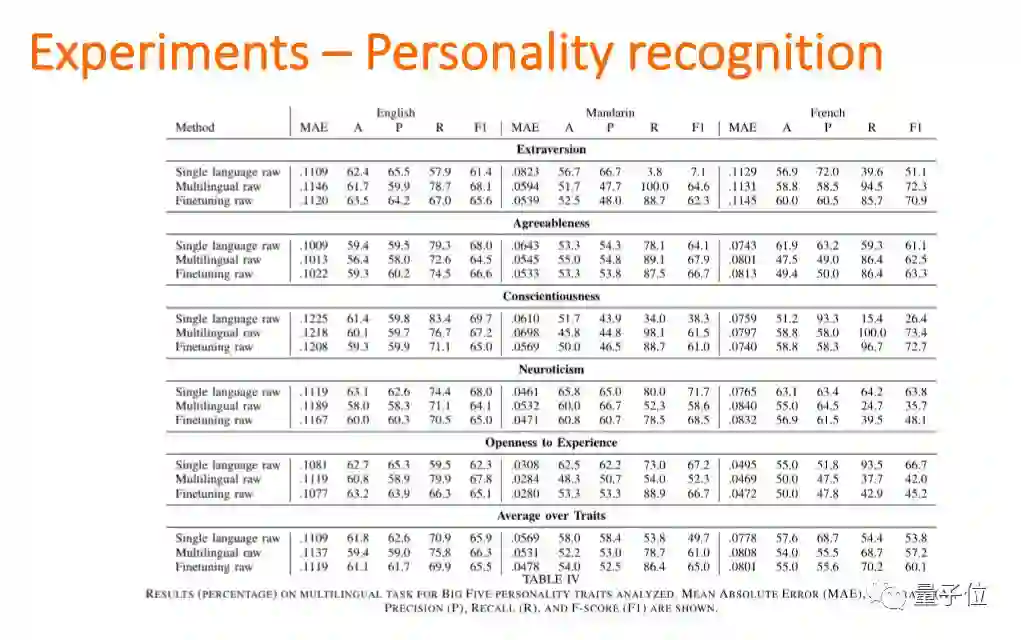 我们能不能用同一个系统去识别?说不同种语言的人他们的性格,直觉上好像不太一样,但是实验之后我们提出一个方法:bilingual word embedding,不论哪种语言,能够识别出一样的意思,那我们就发现可以有一个系统能够通过不同种的语言去分析性格。