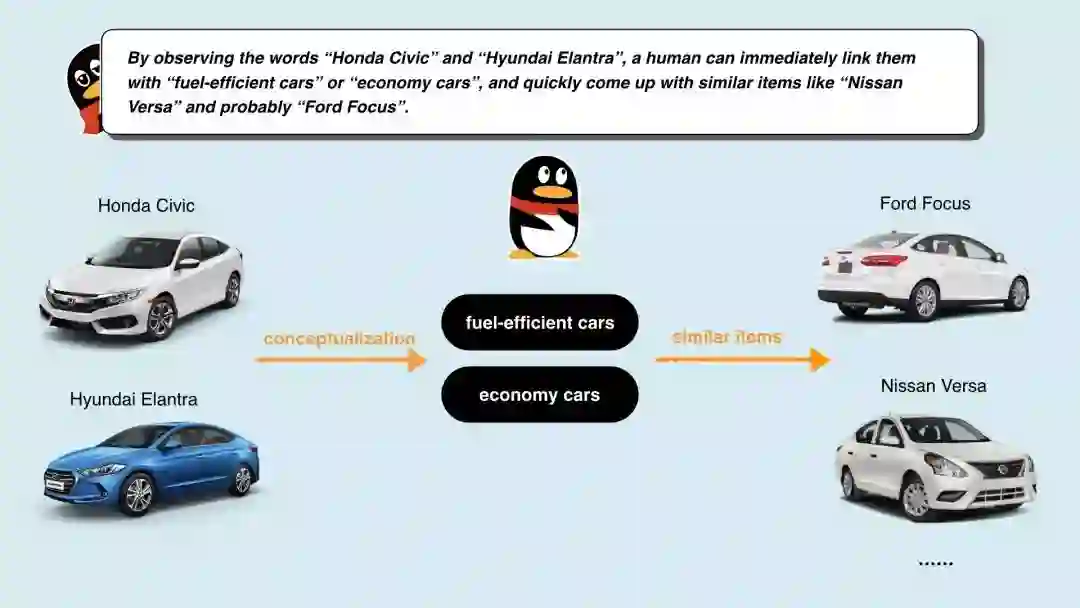 认识“概念”(concept)是人类认识世界的重要基石。对于自然语言理解,提取概念和对文本进行概念化(conceptualization)是至关重要的研究问题。例如,当看到本田思域(Honda Civic)或者现代伊兰特(Hyundai Elantra)时,人们可以联想到“油耗低的车”或者“经济型车”这类的概念,并且能进而联想到福特福克斯(Ford Focus)或者尼桑Versa(Nissan Versa)等车型。