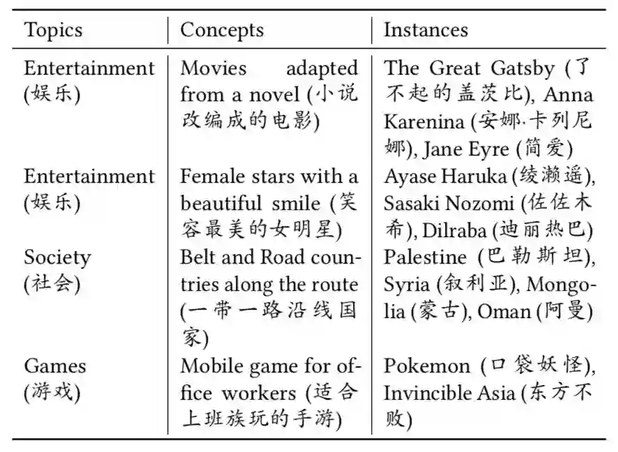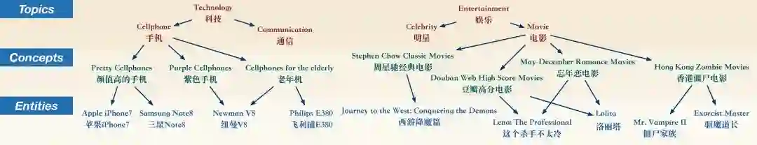 过去的研究工作,包括DBPedia, YAGO, Probase等等知识图谱或者概念库,从维基百科或者网页文章中提取各种不同的概念。但是这样提取的概念和用户的认知视角并不一致。例如,与其认识到丰田4Runner是一款丰田SUV或者说是一种汽车,我们更感兴趣是否能把它概念化为“底盘高的汽车”或者“越野型汽车”。类似地,如果一篇文章在讨论《简爱》,《呼啸山庄》,《了不起的盖斯比》等电影,如果我们能认识到它在讨论“小说改编的电影”这个概念,那么会帮助极大。然而,目前的知识图谱等工作目的是建立一个关于这个世界的结构化知识表示,概念提取自语法严谨的文章。因此,它们不能从用户的视角去对文本(例如query和document)进行概念化,从而理解用户的意图。另一方面,目前的工作也主要在于提取长期稳定的概念,难以提取短时间出现的热门概念(例如“贺岁大片”,“2019七月新番”)以及它们之间的联系。