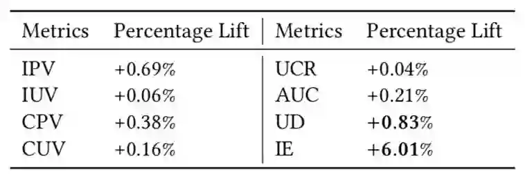 表4. 在线A/B test结果。ConcepT系统对QQ浏览器信息流业务各项指标有明显提升。其中最重要的指标曝光效率(IE)相对提升了6.01%。