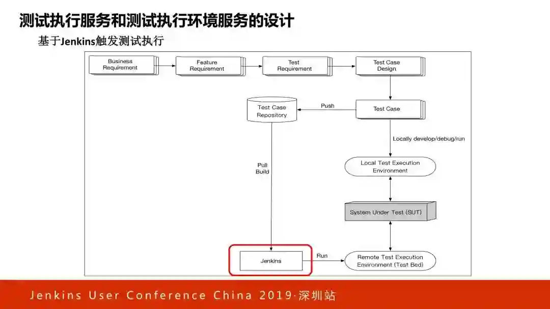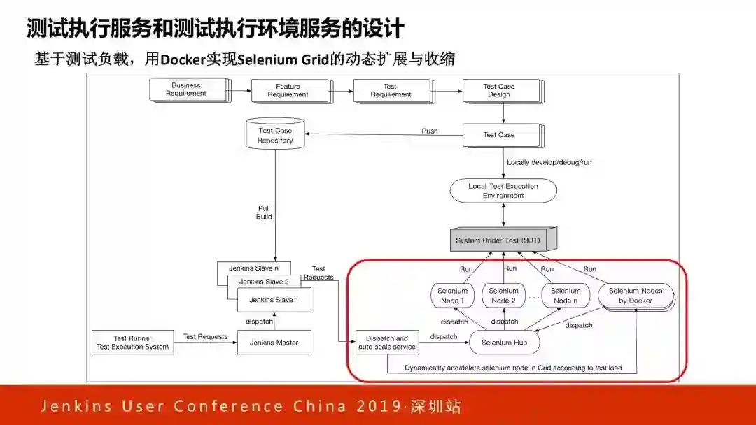 第二部分,测试执行服务和测试执行环境服务的设计。涉及 Jenkins 和容器,帮助我们非常短的时间内完成成千上万测试用例的执行。