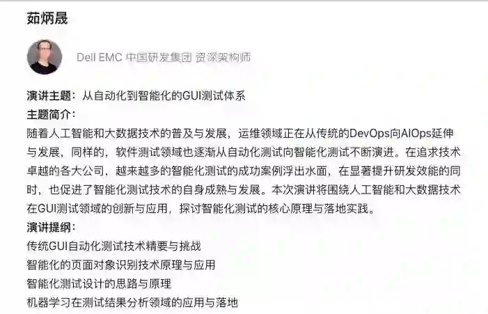 茹炳晟 Dell EMC中国研发集团资深架构师。历任 ebay 中国研发中心测试基础架构技术主管,HP软件中国研发中心资深架构师,阿尔卡特朗讯(Alcatel-Lucent)高级技术主管,思科(Cisco)中国研发中心资深测试工程师等职位,具有超过15年的测试开发与技术管理经验,具有丰富的测试框架设计与自动化测试经验。