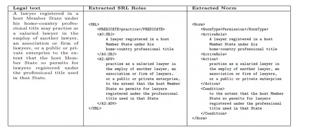 Humphreys和他的同事[36]最近研究了如何从法律文本中自动提取知识,并使用这些知识填充法律本体的问题。为了解决这个问题,他们创建了一个基于自然语言处理和基于领域知识的后处理规则的系统。作者声称他们是第一个使用PropBank语义角色标签从法律文本中提取定义和规范的人。该系统主要由两部分组成。第一个组件是Mate Tools语义角色标记器[10],它从法律文本中提取抽象语义表示以及依赖解析树。第二个组件由一组规则组成,这些规则标识可能的规范和定义,对它们的类型进行分类,并将语义角色树中的参数映射到法律本体中特定领域的位置。使用SRL的优势在于,它用相关的语义信息丰富了句子解析树,这将简化为提取规范和定义而必须创建的规则。