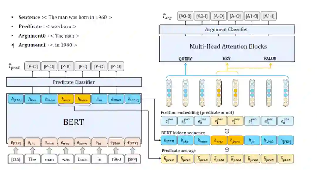 Multi2OIE的体系结构。利用BERT的隐藏状态提取谓词,然后将隐藏序列、谓词的平均向量和位置嵌入连接起来,作为多头注意力块的输入进行参数提取。