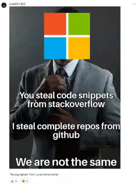 对于微软此番的“误操作”,不少网友都发表评论调侃。有网友表示,“你从 Stackoverflow上偷取代码片段,我从GitHub上偷取完整的软件,我们是不一样的”;还有网友称这是“典型的微软行为”。