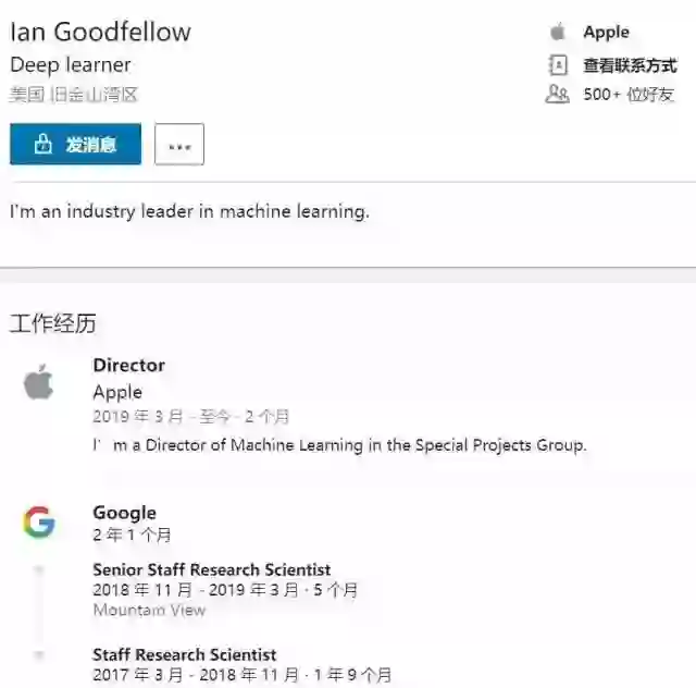 日前,Ian Goodfellow 的 LinkedIn 账户已经更新他的最新职位信息: