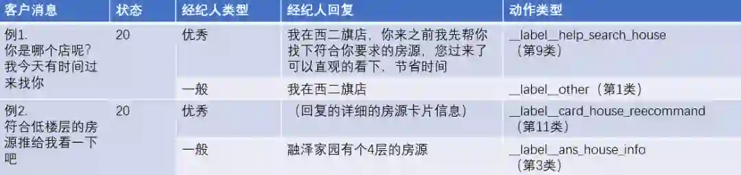 如上图所示,两个例子中,当前客户消息都处于状态20,优秀经纪人和一般经纪人的回复是存在差异的,因此,可根据这些差异来指导一般经纪人进行合适动作选择。