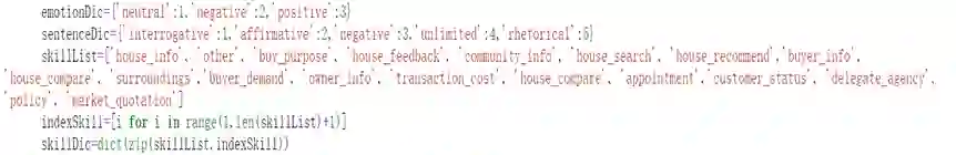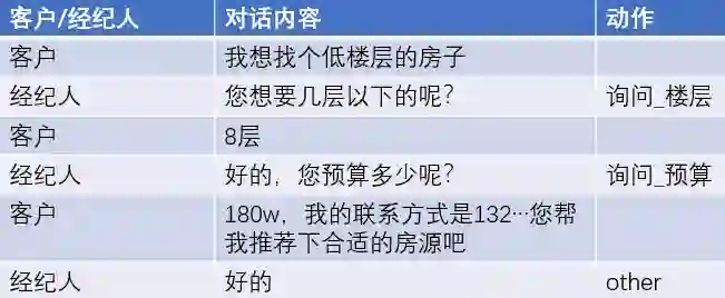 经纪人的动作是根据动作分类模型得到的,动作共分为19种,动作和其id的对应关系:action2id={'__label__other':1, '__label__send_house_reoprt':2, '__label__ans_house_info':3, '__label__date_look_time':4, '__label__buy_purpose':5, '__label__date_look_house':6, '__label__open_words':7, '__label__leave_contact':8, '__label__house_recommand':12, '__label__ask_buyer_info':13, '__label__confirm_demand':14, '__label__platform_safe':15, '__label__date_location':16, '__label__overall_demand':17, '__label__detail_demand':18, '__label__end_words':19}