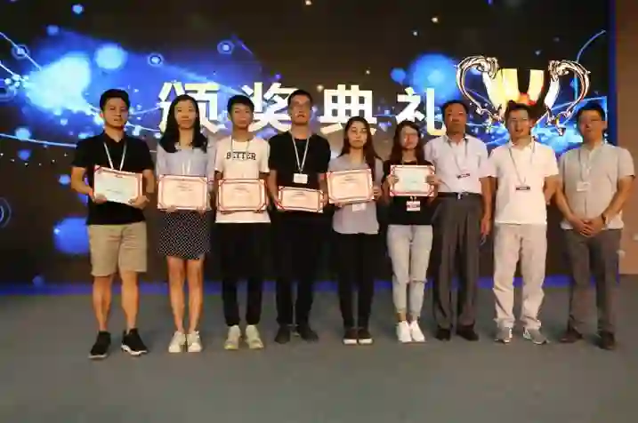 中国人工智能学会科普工作委员会秘书长、北京工业大学于乃功教授(右三)、北京盛开互动科技有限公司CEO曾祥永(右二)、中科曙光解决方案中心副总工程师明立波(右一)为三等奖颁奖