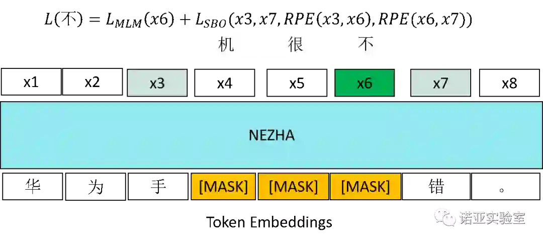 此外,借鉴SpanBERT ,NEZHA模型还引入了Span预测任务,该任务Mask一个连续的Span(例如下图中“机”,“很”,“不”三个字),利用Span前后的两个字的最上层表示(下图中的x3和x7)以及待预测字的位置信息来预测该字,如下图中,待预测字为“不”,Span预测任务会使用x3,x7和“不“”这个字的位置信息(就是x3和x6还有x6和x7之间的相对位置编码)来预测该字,“机”和“很”的预测也是同样的方法。该方法使得Span前后的字的表示会包含Span中字的语义信息,由于在训练过程中,一个句子会被随机Mask很多次,所以句子中每个字都有机会成为Span的前后字,进而使得各个字学到的表示都会包含周围Span的信息,Span预测任务能够有效提高模型在下游的Span抽取任务(此任务的目标是获取一段文字中目标片段的开始和结束位置)的效果。
