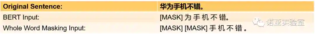 预训练任务:本工作引入了全词Mask技术,即不同于原始的BERT模型Mask单个中文字,该技术在MLM预训练任务中Mask整个词而不是单个字(如下图全词Mask方法Mask了一整个词“华为”),进而提升了任务难度使得BERT学到更多语义信息。